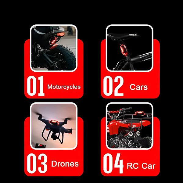 Këto drita janë jashtëzakonisht të larmishme dhe të dizajnuara për të përshtatur me automjete, motoçikleta, biçikleta dhe dronë. Mund të zgjidhni midis metodave të instalimit me velcro ose me unazë gome për një instalim të thjeshtë dhe të sigurt. Nuk ka nevojë për mjete të komplikuara ose ndihmë profesionale.