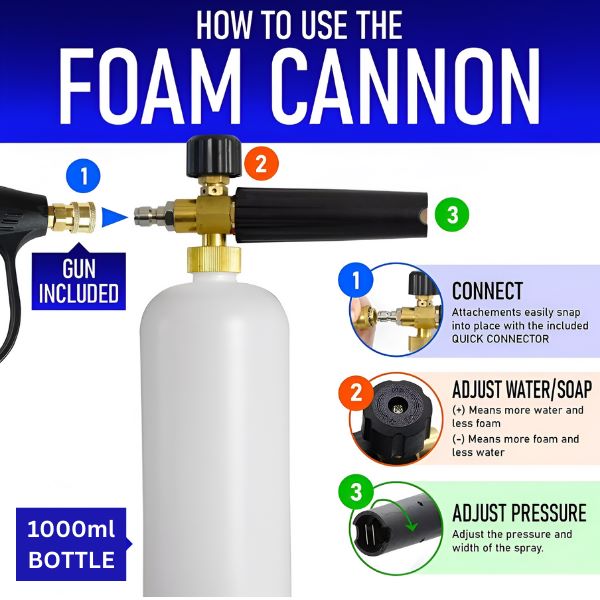 Mbushni shishen me sapun dhe ujë të ngrohtë, lidhni lidhësin e shpejtë me pistoletën e larjes dhe rregulloni butonin e sipërm në nivelin e dëshiruar të shkumës.